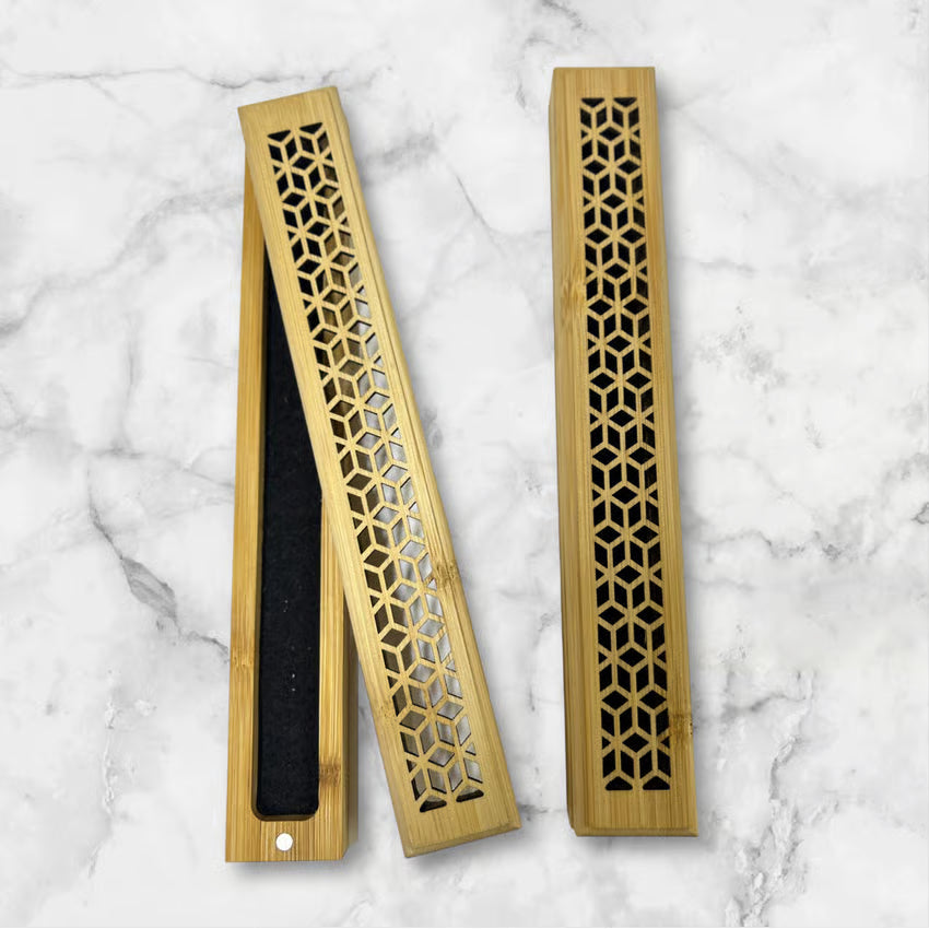 A beautifully crafted wooden incense burner designed with an elegant geometric pattern.